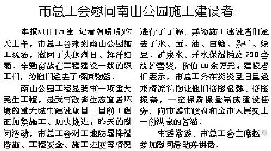 本報(bào)訊(田萬(wàn)生記者魯暘暘)昨天上午,市總工會(huì)來(lái)到南山公園施工現(xiàn)場(chǎng),慰問(wèn)了頭頂烈日、揮汗如雨、辛勤奮戰(zhàn)在工程建設(shè)一線的職工們,為他們送去了清涼物資。