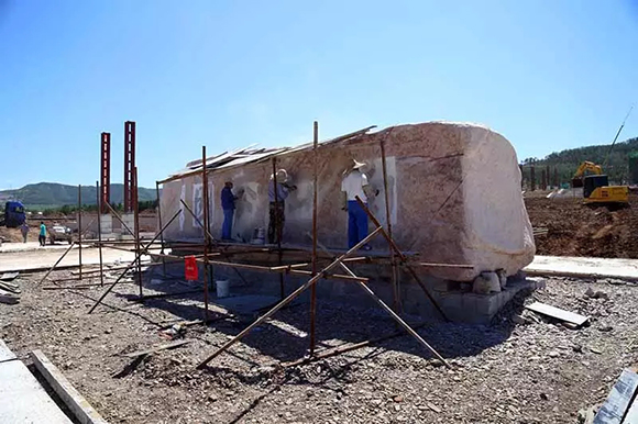 該景觀置石長(zhǎng)11.5米,寬1.8米,高3米,重200余噸,材質(zhì)為花崗巖,是從凌海市石山鎮(zhèn)運(yùn)過(guò)來(lái)的。
