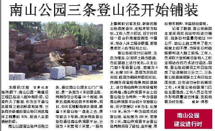 南山公園登山徑共設(shè)有三條,通過南山公園主山門廣場(chǎng)后,是一條寬為8米的登山徑,兩側(cè)均勻分布著20個(gè)樹池,栽種五角楓和絲綿木等樹種。同時(shí),中央?yún)^(qū)域配有親水景觀。順著8米登山徑一直走上去,便可到達(dá)5號(hào)路。其余兩條登山徑均通往南山秋觀景平臺(tái),分別為4米寬和2米寬。一路向上攀爬時(shí)記者發(fā)現(xiàn),新修的登山徑高度適中,走起來較為輕松。工作人員介紹說,設(shè)計(jì)時(shí)將每一級(jí)臺(tái)階高度控制在15厘米,符合人體工程學(xué)原理,即使是老年人也可輕松上山。